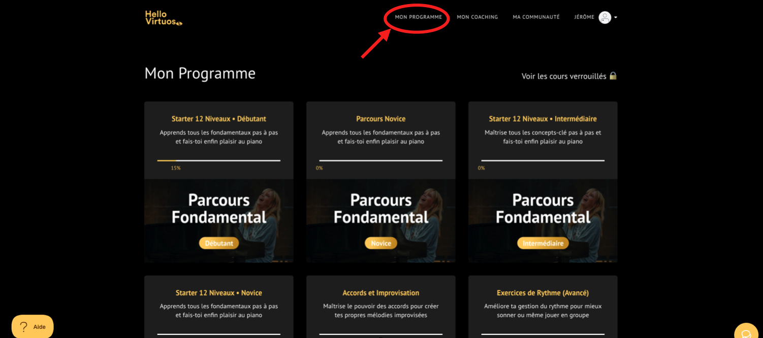 La première étape consiste à cliquer sur l'onglet "Mon Programme" situé dans le menu principal de ton espace personnel. Tes vidéos sont organisées en parcours progressifs pour une consultation claire et efficace.