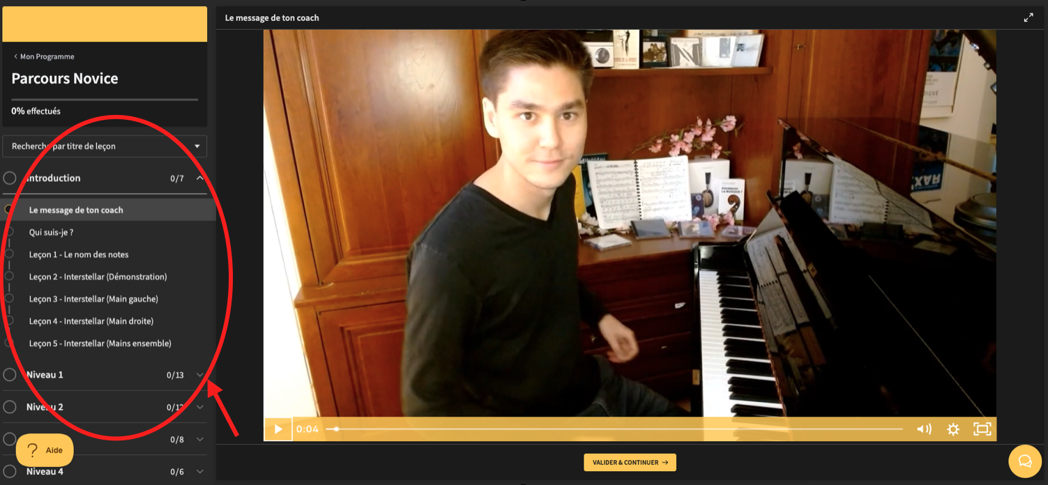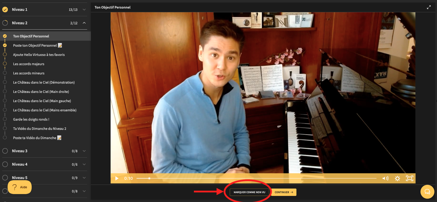 Le petit rond situé en face du titre de chaque vidéo prend la couleur jaune pour te montrer que tu as déjà visionné la vidéo. Tu peux cliquer à tout moment sur ce rond pour revoir une leçon.