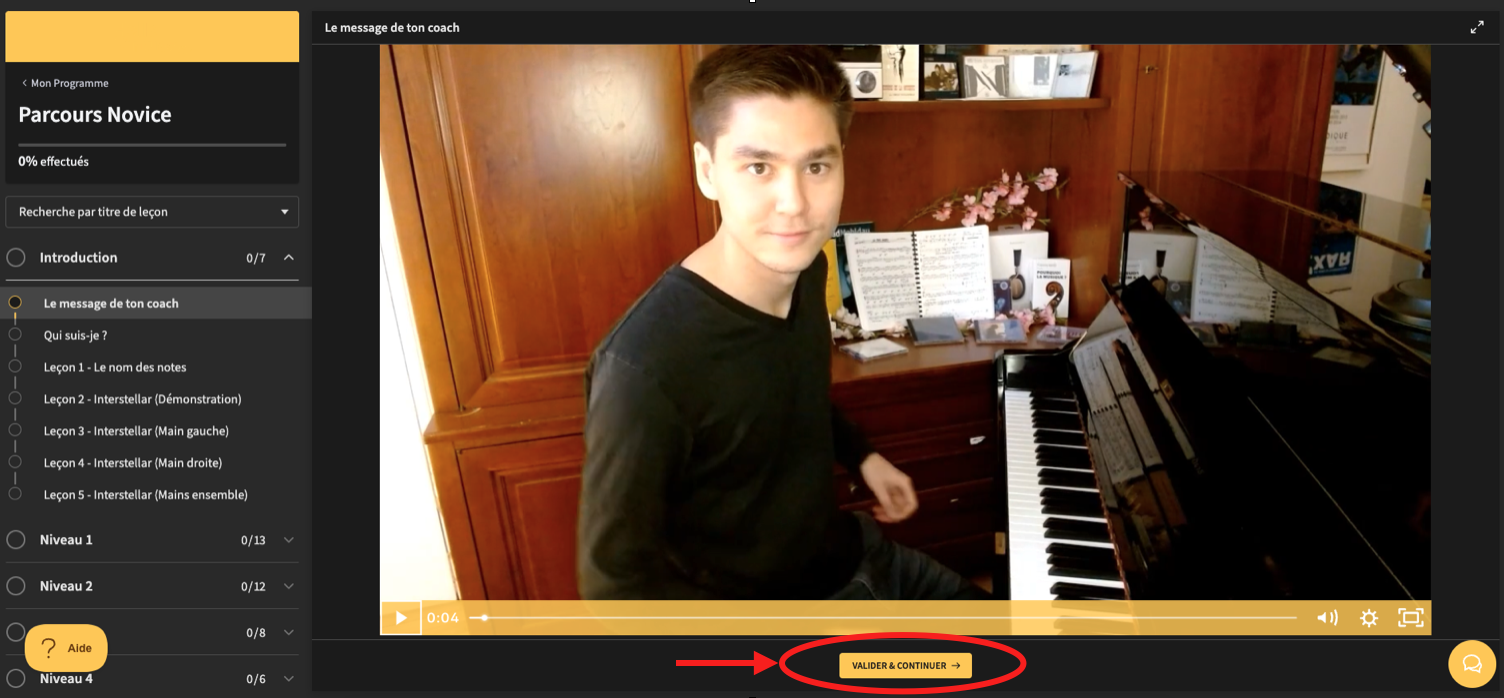 L'étape suivante consiste, une fois la leçon terminer, à cliquer sur le bouton "Valider et continuer". La vidéo suivante démarre automatiquement.