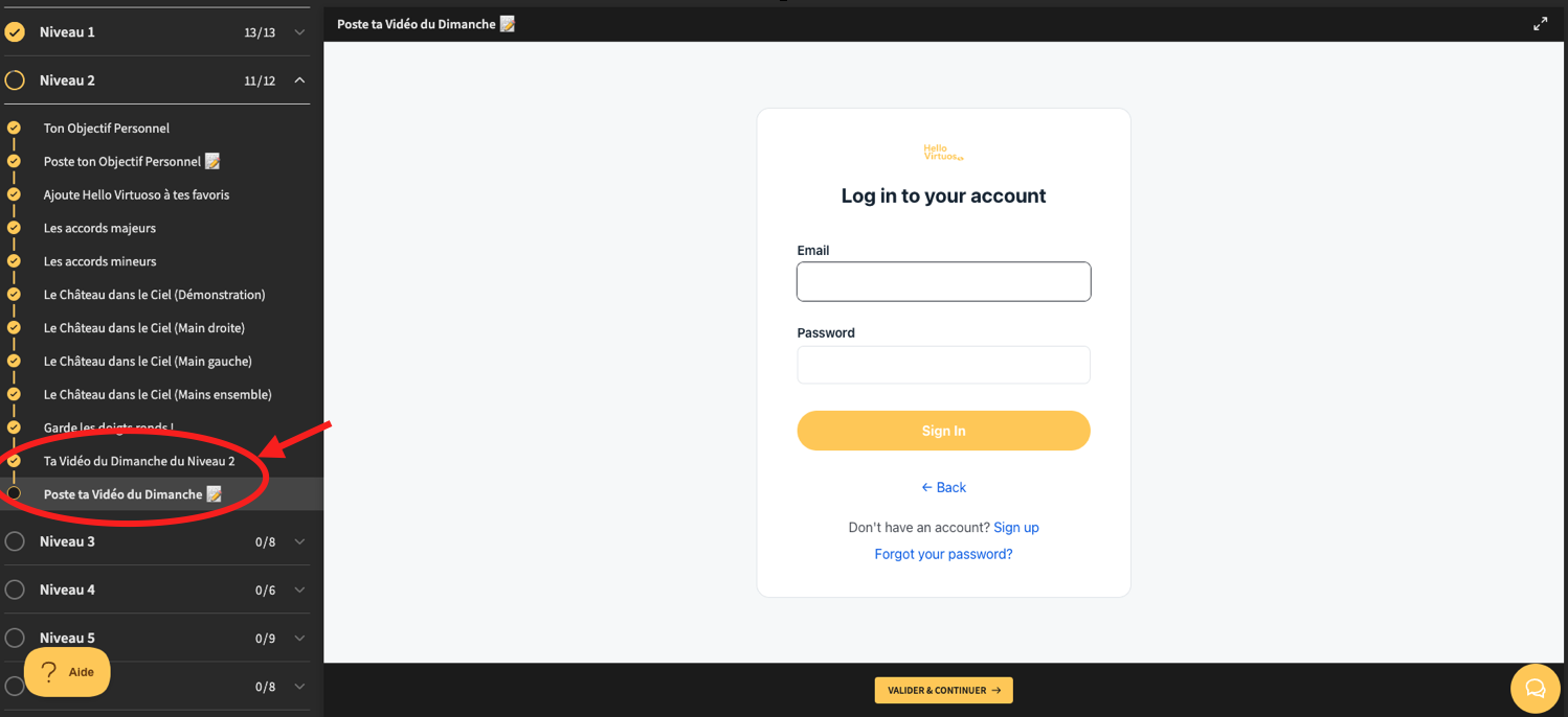 Les activités liées à la vidéo du dimanche sont intégrées à ton parcours d'apprentissage et doivent être marquées comme terminées, au même titre que les leçons vidéo. En cas d'oubli, la plateforme identifiera le module comme incomplet et te redirigera vers celui-ci lors de tes prochaines connexions.
